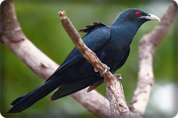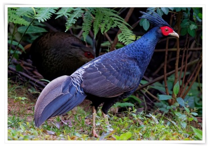Resident and locally common. Inhabits all types of forest with dense undergrowth and thickly overgrown steep gullies, usually not far from water. Males are rather variable depending on the sub Species involved, but all have an at least partially glossy bluish-black plumage, while females are overall brownish. Both sexes have a bare red face and greyish legs. - Size: ranging in length from 63-74 cm (25 to 29 inches).