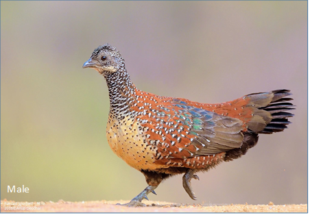 The painted spurfowl is a bird of the pheasant Family found in rocky hill and scrub forests mainly in peninsular India. Males are more brightly coloured and spotted boldly in white. Males have two to four spurs while females can have one or two of the spurs on their tarsus. The Species is found mainly in rocky and scrub forest habitats unlike the red spurfowl. It is found in the undergrowth in pairs or small groups, escaping by running and rarely taking to the wing when flushed. - Size: 27-34 cm
