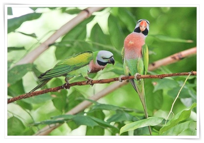 The plum-headed parakeet (Psittacula cyanocephala) is a parakeet in the family Psittacidae. It is endemic to the Indian Subcontinent and was once thought to be conspecific with the blossom-headed parakeet (Psittacula roseata) but was later elevated to a full species. Plum-headed parakeets are found in flocks, the males having a pinkish purple head and the females, a grey head. They fly swiftly with twists and turns accompanied by their distinctive calls. - Size: 30-33 cm in length including the tail feathers.